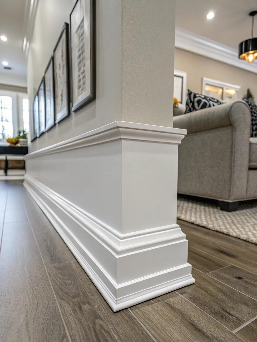 Installation of baseboards, crown molding, door and window trim, and detailed finish carpentry for a polished interior look.